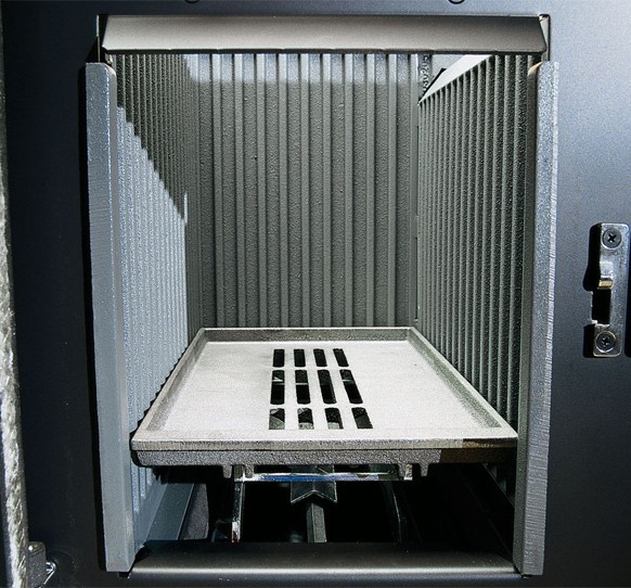 Revêtement extérieur en faïence • Foyer entièrement en fonte • Porte foyer panoramique avec vitre céramique • Four émaillé panoramique (28 l) • Cadre, plaque et cercles en fonte • Grand tiroir à bois